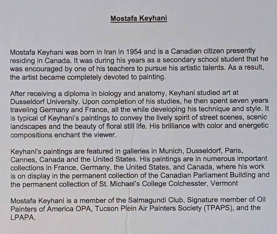 Keyhani is an incredibly popular contemporary impressionist painter known for vibrant and lively street scenes, scenic landscapes and the detailed beauty of floral still life scenes. Currently, based in Toronto, Ontario, he studied art at Tehran and Dusseldorf Universities before immigrating to Canada. His work is currently exclusively shows through the prestigious Westmount Gallery in Toronto.